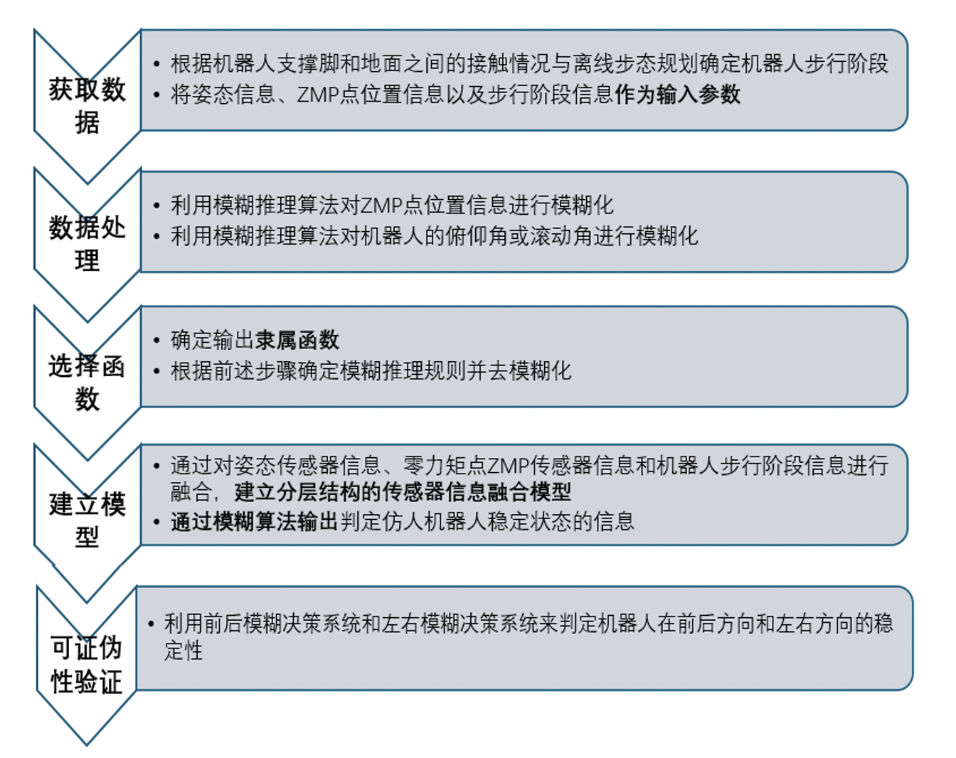 示例2:涉及一种基于多传感器信息仿人机器人跌倒状态检测方法[5],见图2。该方法申请人通过模糊化算法处理输入数据,输出隶属函数并建立预测模型,为进一步发出准确的机器人姿势调整指令提供依据。