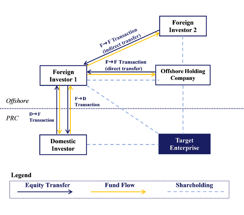 F→F Transaction in this article refers to a transaction in which a foreign shareholder transfers shares of an FIE to another foreign investor, either directly by transferring shares of the FIE itself ("Direct Transfer"), or indirectly through transferring shares of the offshore entity holding shares of the FIE ("Indirect Transfer").