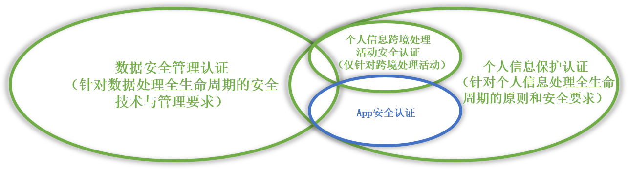 需要特别注意的是,虽然网络安全管理认证和个人信息保护认证的认证对象与适用范围十分相似,分别针对网络数据与个人信息,存在范围上既有交叉又有各自独特性,例如个人信息处理活动中存在跨境个人信息处理活动的特殊性。而App安全认证则属于网络数据安全管理和个人信息保护下针对特定类别产品进行专项认证的深化。
