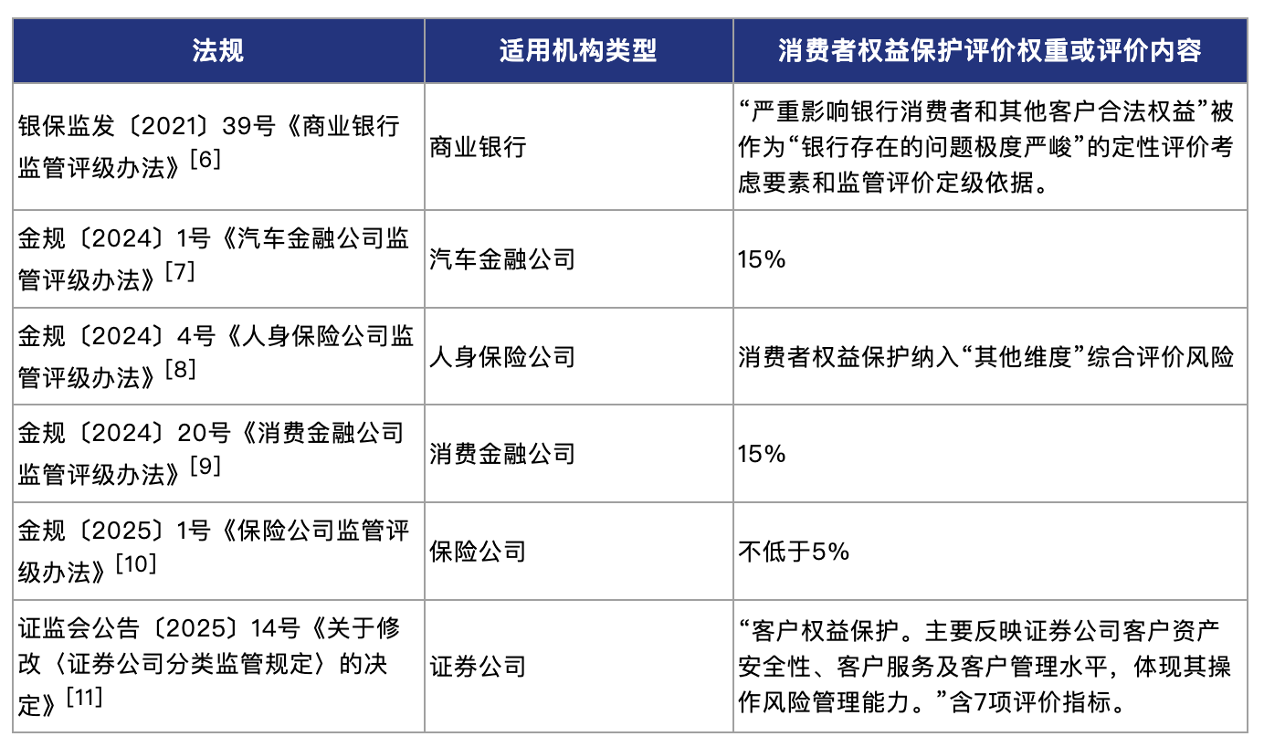 权重明确型:对于消费金融公司和汽车金融公司,其监管评级办法均明确赋予了“消费者权益保护”15%的高权重。而对保险公司的监管评级中,“消费者权益保护”的权重则被设定为不低于5%的底线。这种量化的硬性指标,使得消保工作的成效能够直接、显著地影响最终的评级分数。