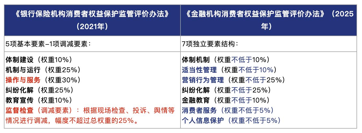 拆分与凸显:将21版办法“操作与服务”要素中的核心内容进行拆分,并赋予更高的重要性,“营销行为管理”和“适当性管理”被提升为两个独立的、且权重较高(不低于25%、不低于10%)的评价要素。这首先是对《金融机构产品适当性管理办法》[12]《证券期货投资者适当性管理办法(2022年修正)》[13]等部门规章的对齐,也直接反映了监管部门对金融产品营销宣传和投资者适当性匹配这两个消保关键环节的高度关注。