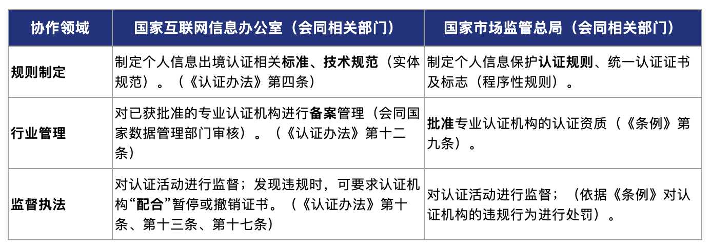 《办法》的条文清晰界定了国家互联网信息办公室与国家市场监督管理总局在个人信息出境认证工作中的协作关系: