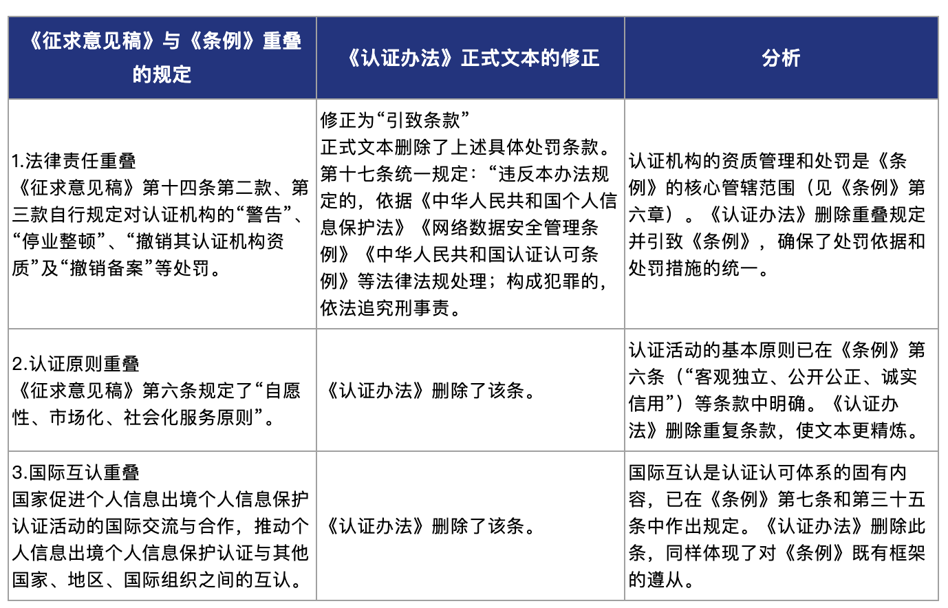 在我们此前对《征求意见稿》解读[2]的基础上,本文将通过对认证办法文本的比对、对监管逻辑的推理以及简要的比较法分析,为跨国企业及领域专业人士提供解读和参考。本文的附表中包含《征求意见稿》和正式文本的完整比对,并以不同的格式标注了其他值得注意的变化。