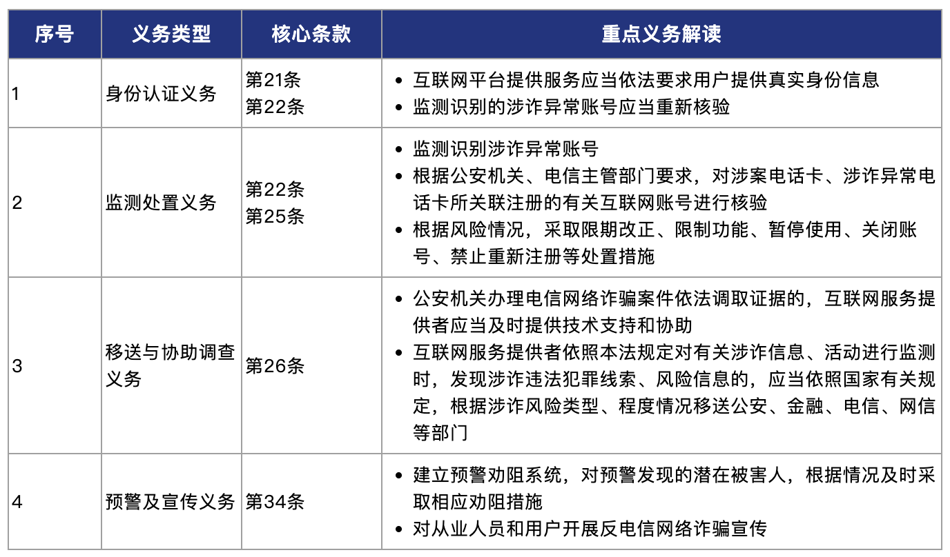 《反电诈法》第四章专章规定了互联网治理,对互联网平台的主要法定义务集中体现在第21条至第26条。结合第五章有关综合措施的规定,可以将互联网平台在《反电诈法》中的反电诈义务概括为如下几类:
