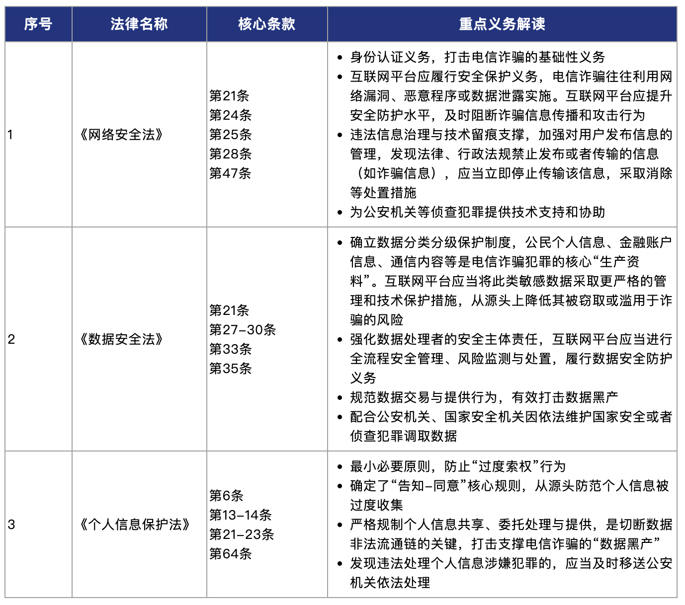 《个人信息保护法》(侧重保护个人信息权利)与《网络安全法》(侧重保障网络系统安全)、《数据安全法》(侧重数据活动全流程安全)、《反电诈法》(侧重专项打击电信网络诈骗)共同构成了一个“保护权利-保障安全-打击犯罪”三位一体的严密法律网络,从信息的生产、流通到滥用末端进行全链条治理,互联网平台的基本合规义务也分布在上述不同的法律之中,互联网平台在开展反电诈治理时,应当准确识别其所应当履行的平台义务,针对性开展平台反电诈治理。