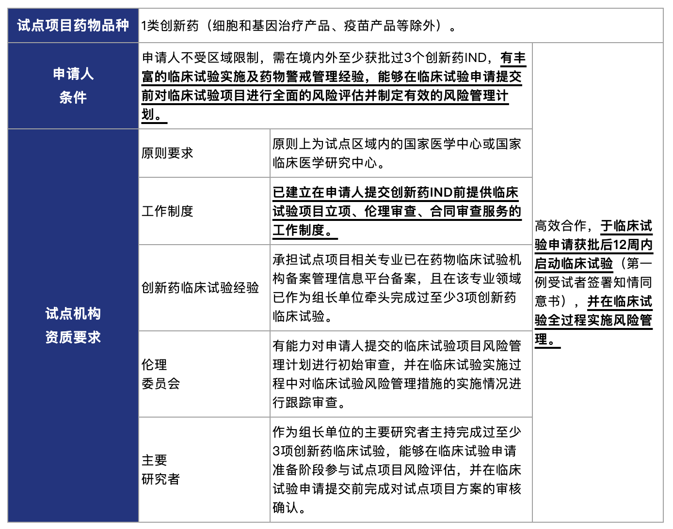 试点方案明确了试验项目适用药品种类的范围、项目申请人的条件以及试点机构的资质要求,实则已呈现了《优化创新药IND审评审批公告》所规定的核心制度框架。具体梳理如下: