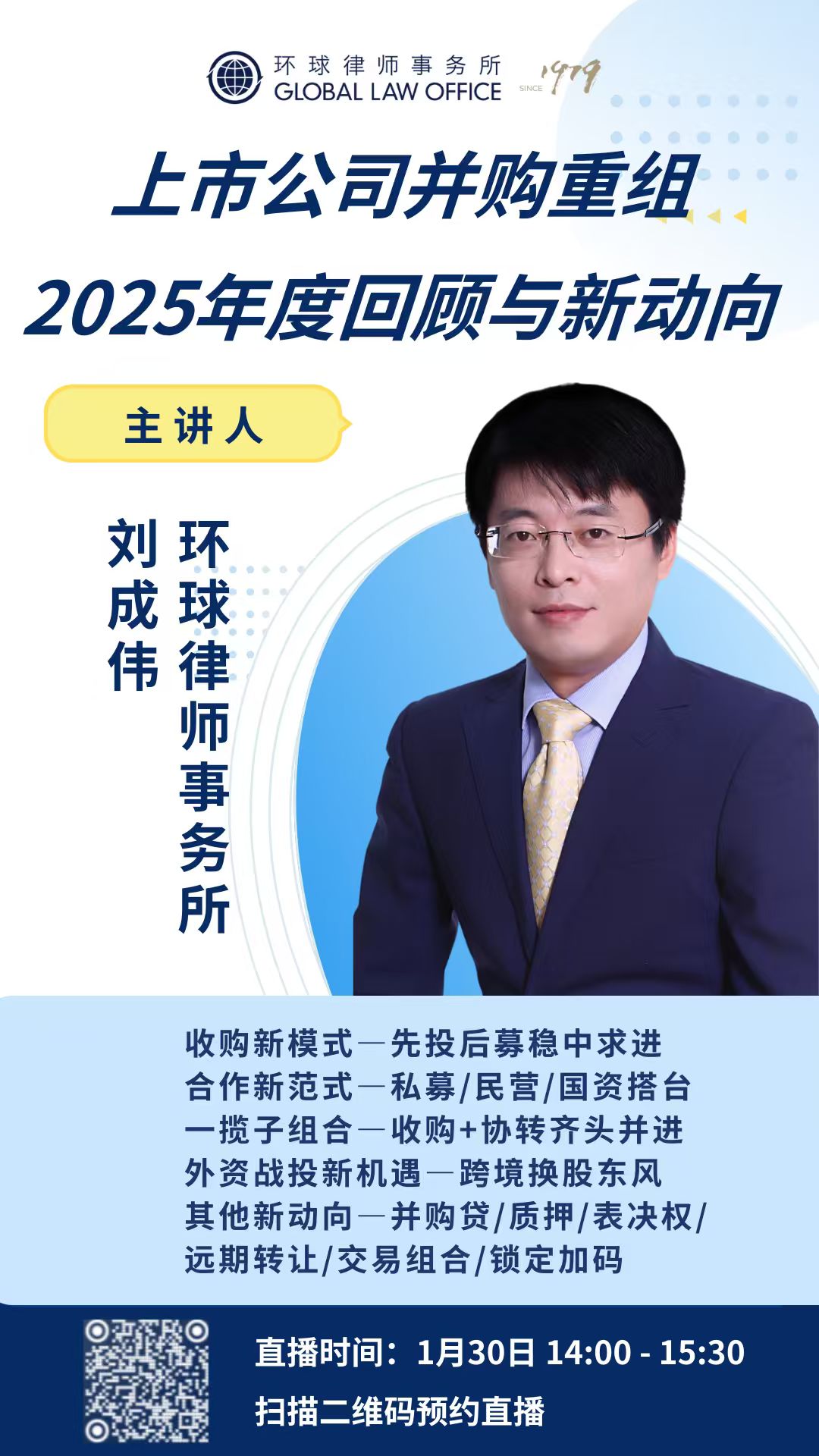 基于对2025年度上市公司并购重组市场的持续跟踪与深度参与,环球律师事务所刘成伟将围绕全年典型模式与最新动向,从交易逻辑、协作架构、融资工具、权义配置等多个维度展开系统性剖析,梳理合规关键点,解读策略演进路径。诚邀各位业界同仁参与本次直播交流,共同回顾年度实践、把握趋势脉络,在变革中凝聚专业共识,探索可持续的价值整合路径。