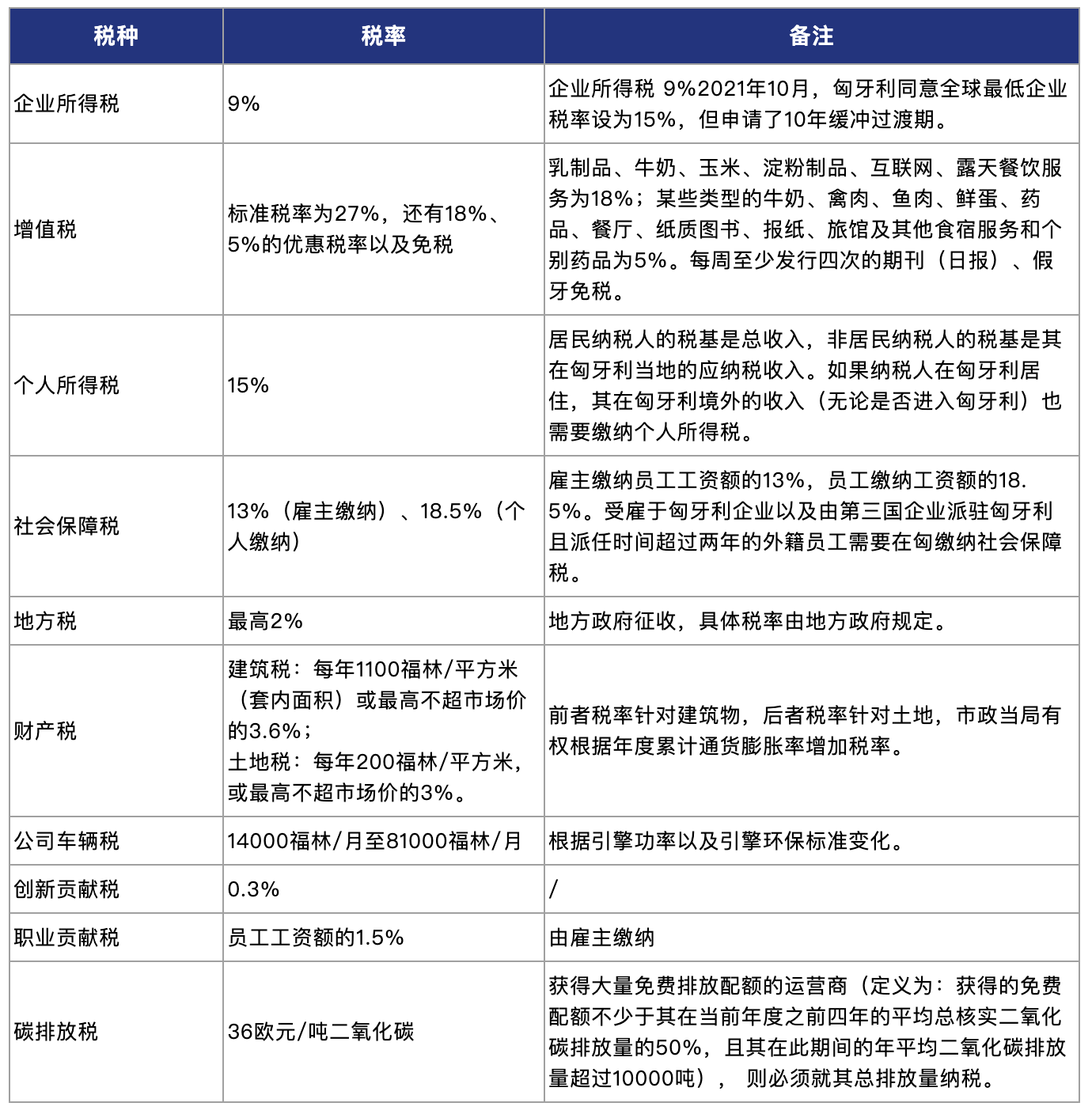 匈牙利现行税制以所得税为主体税种,辅以其他税种。主要包括:企业所得税、增值税、个人所得税等。针对特定行业和产品,匈牙利还有消费税、公共健康产品税、环保产品税、能源税、电信税、印花税等。企业在匈牙利应缴纳的主要税种及税率如下表[3]: