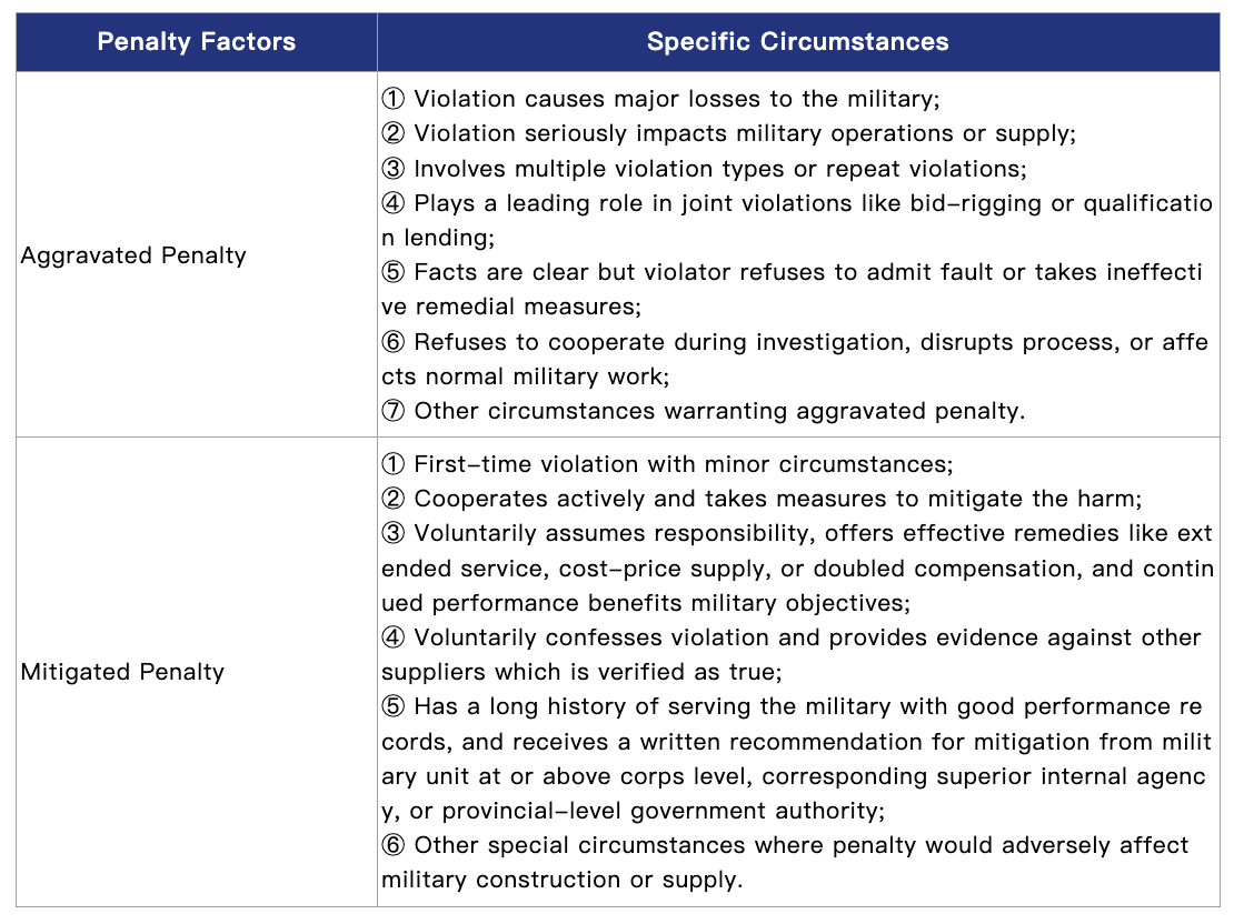 Furthermore, according to the Notice on Clarifying Issues Concerning the Handling of Violations by Suppliers of Military Materials, Engineering, and Services (Military Procurement No. 175 [2022]) and related regulations, military procurement authorities may impose aggravated or mitigated penalties based on specific circumstances.