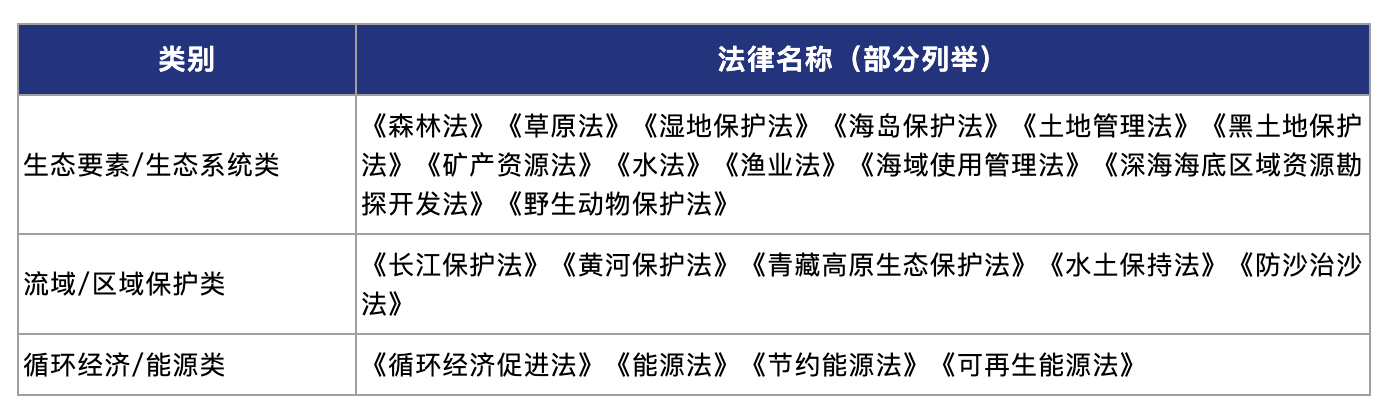 除前述将被取代的法律法规外,生态环境领域大部分相关法律法规,包括如下涉及流域、区域、自然资源、生物多样性、循环经济等领域的,法典生效后仍将继续有效,与法典共同构成新时代的生态环境法律体系: