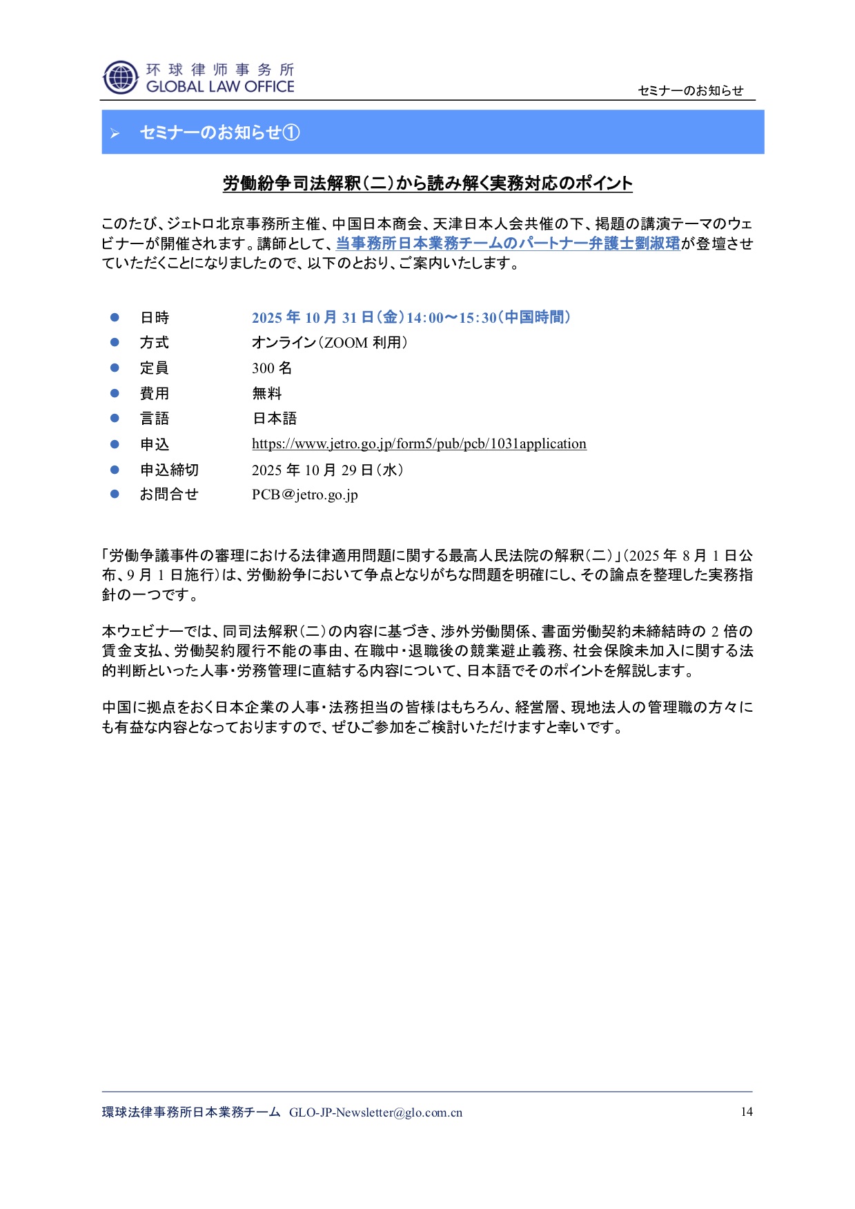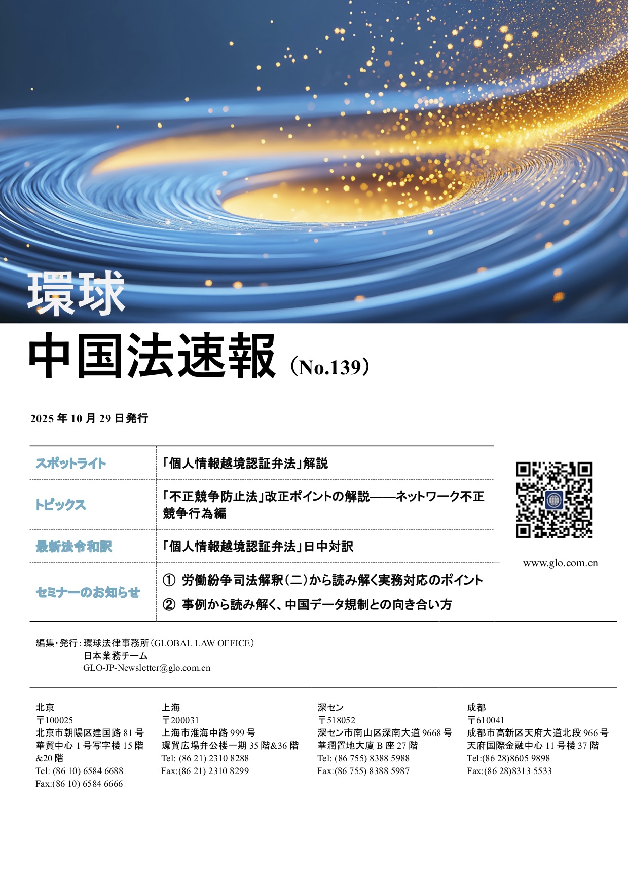 本速報の著作権は当事務所日本業務チームに帰属します。日本語版「環球中国法速報」のE-mail配信を希望される方は、「点此订阅」ボタンをクリックし、申込フォームに必要事項をご記入の上、お申し込みください。