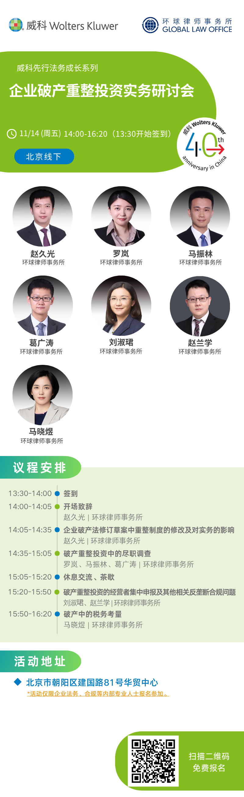 在此背景下,环球律师事务所携手威科先行精心策划11月14日北京线下企业破产重整投资实务研讨会,就企业破产法修订草案中重整制度的修改与影响以及重整投资中尽职调查、反垄断合规和税务考量等实务话题进行深度研讨和交流,并发布由环球律师事务所多位律师撰写的《破产重整投资实务指引》,以期为企业和法律工作者带来有益参考。诚邀您的参与!