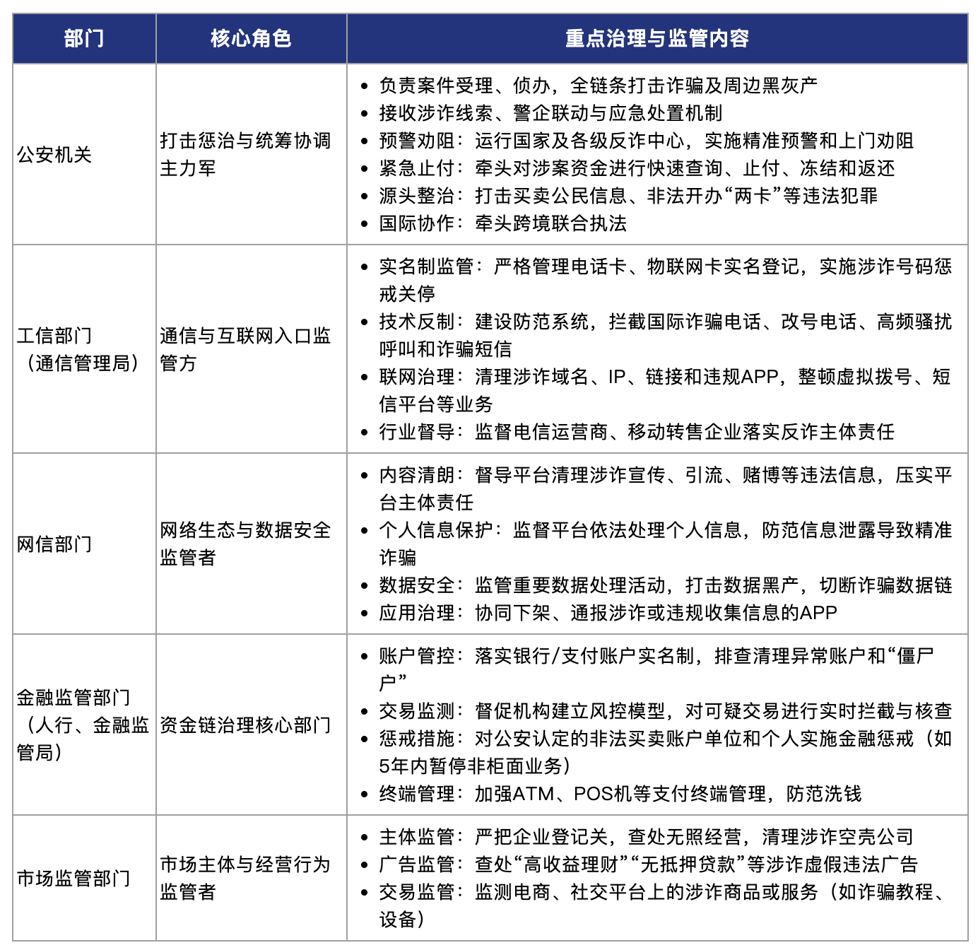 上述各部门并非各自为战,而是在国务院批准建立的由公安部、工信部、中宣部、中国人民银行等23个部门和单位组成的打击治理电信网络新型违法犯罪工作部际联席会议制度的框架下形成了紧密协作的治理格局。例如,公安机关将涉诈线索推送给工信部和通信管理局,后者对相关号码、域名进行关停封堵;工信部将监测到的涉诈网址、APP推送给网信部门予以下架清理,公安机关又将查实的涉案账户信息推送给金融监管部门实施惩戒和管控等等。总结而言,我国反电诈治理是一个系统工程:公安主打击、工信管通道、网信清空间、金融断资金、市监整秩序,各部门在法律框架下,通过数据共享、线索互通、联合执法,共同构建“事前预警、事中阻断、事后打击”的全链条防治体系。互联网平台应当明确不同监管机关的职责分工和执法重点,才能更加有针对性地回应监管机关需求、完善自身合理安排。