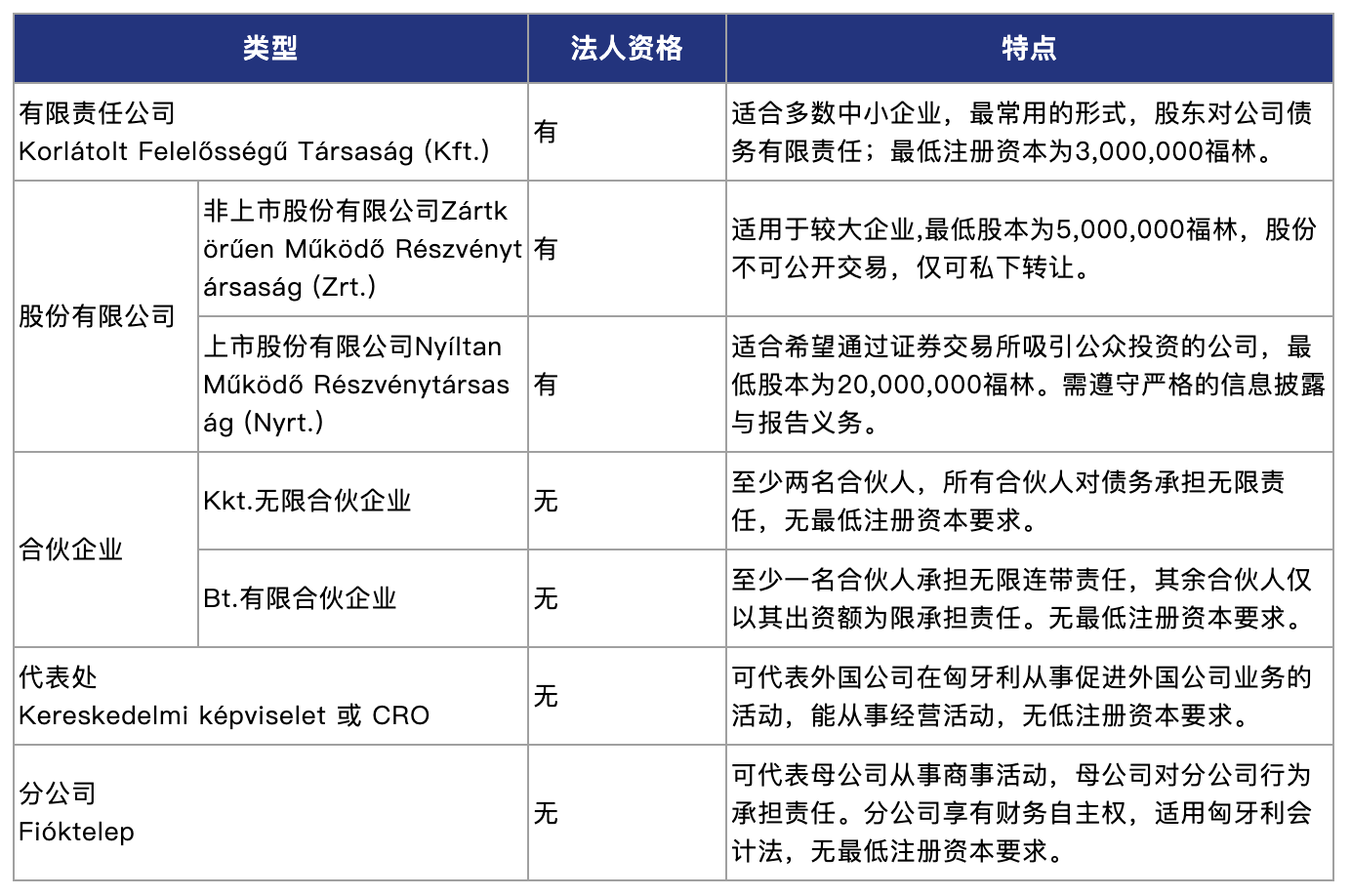 匈牙利法律允许设立多种形式的商业主体,设立者需向主管的商事注册法院注册,适用于不同类型的商事活动。主要商事主体形式各具特点,具体如下:
