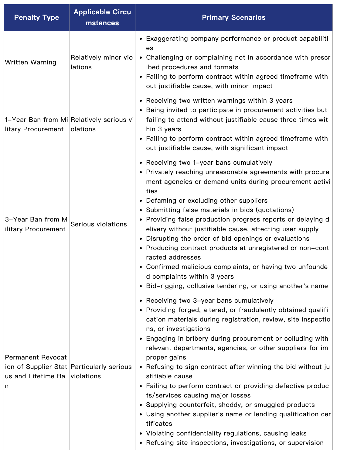 According to the Regulations on the Management of Suppliers for Military Materials, Engineering, and Services (Military Procurement No. 512 [2016]) and related provisions[1], military procurement authorities may impose penalties ranging from written warnings to lifetime bans from military procurement, depending on the nature and severity of the violation. Details are as follows: