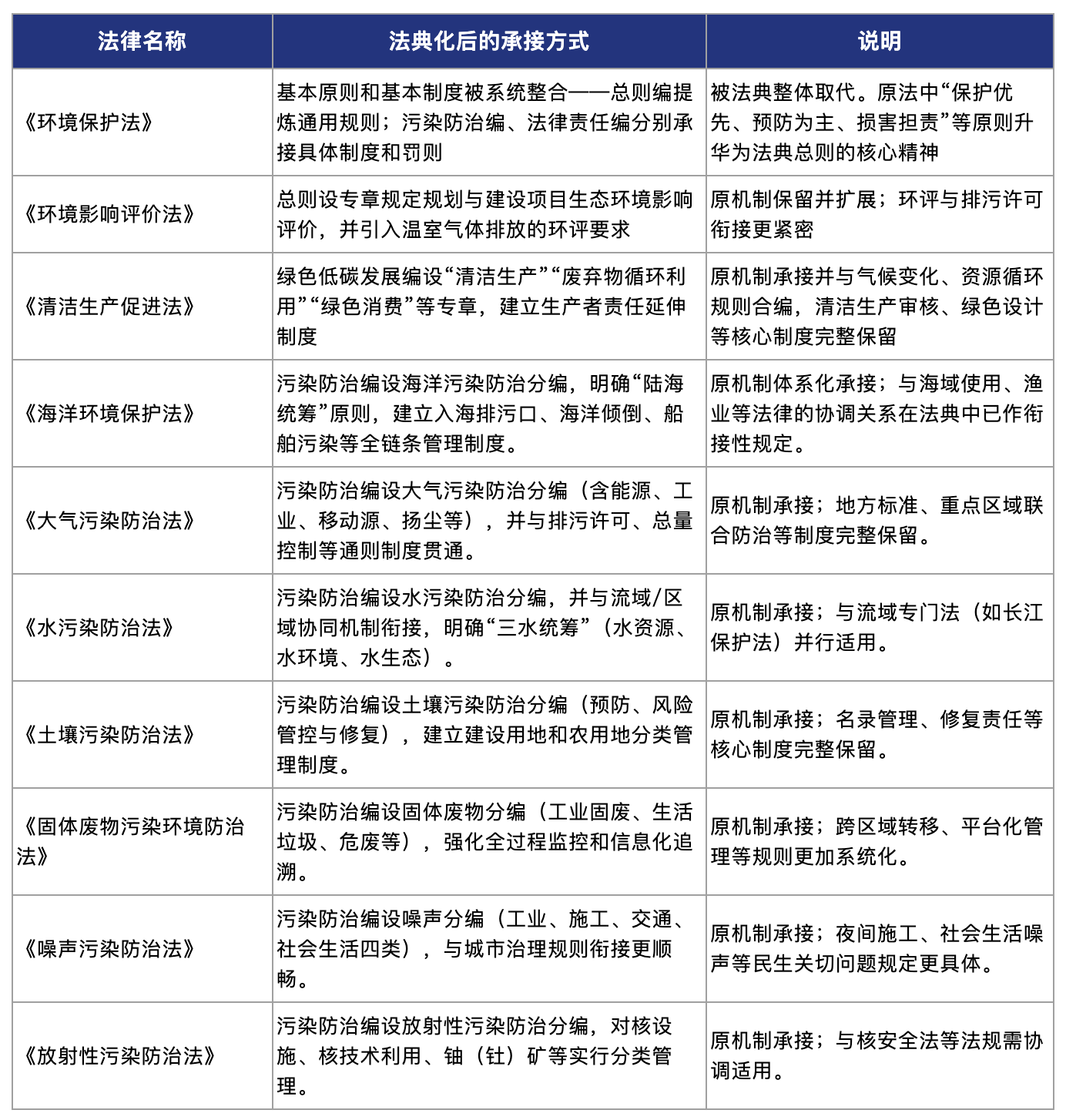 除前述将被取代的法律法规外,生态环境领域大部分相关法律法规,包括如下涉及流域、区域、自然资源、生物多样性、循环经济等领域的,法典生效后仍将继续有效,与法典共同构成新时代的生态环境法律体系: