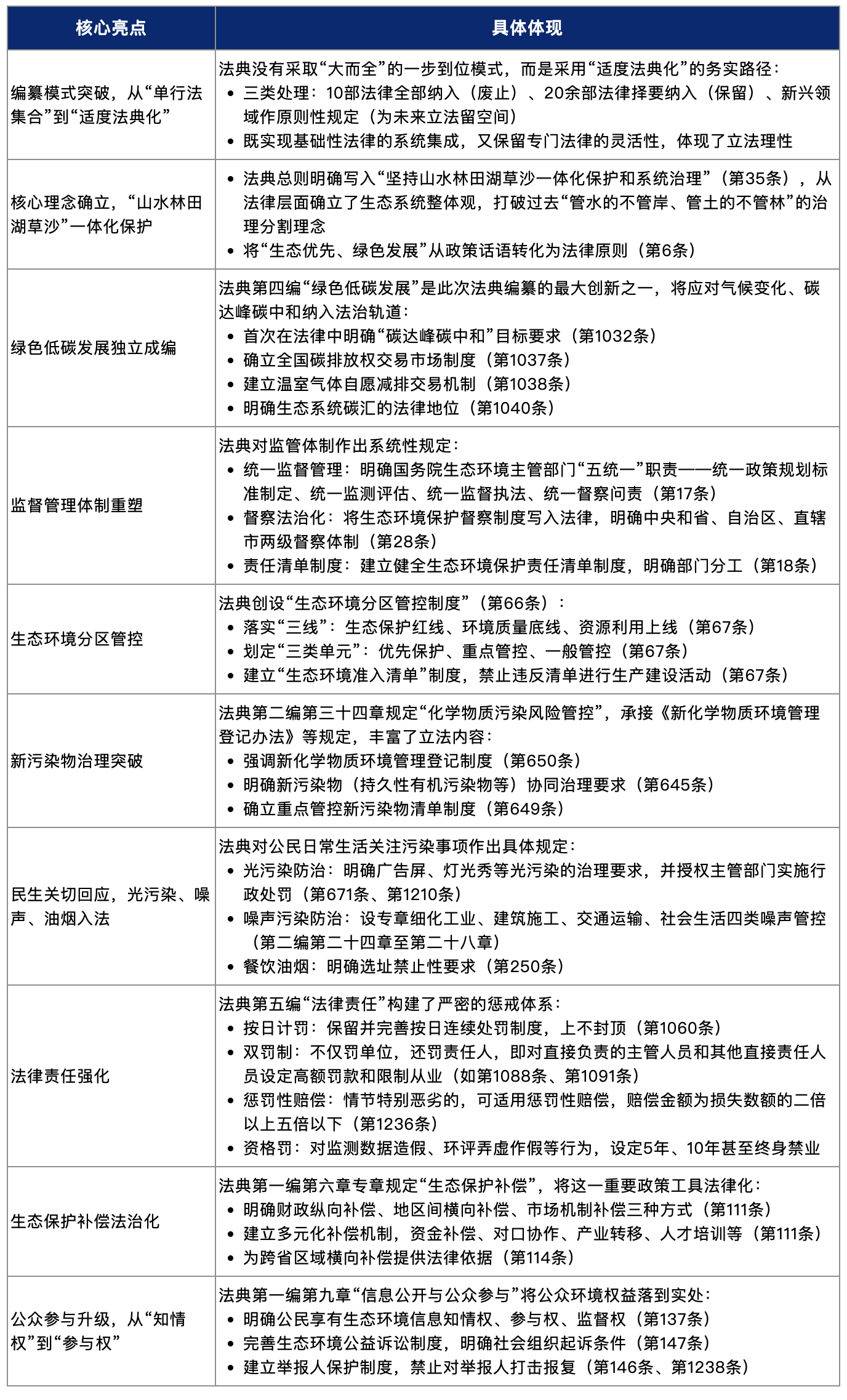 法典从立法模式、核心理念到具体制度层面都在现有生态环境法律法规制度基础上进行了相应革新,其中我们认为值得特别关注的亮点有: