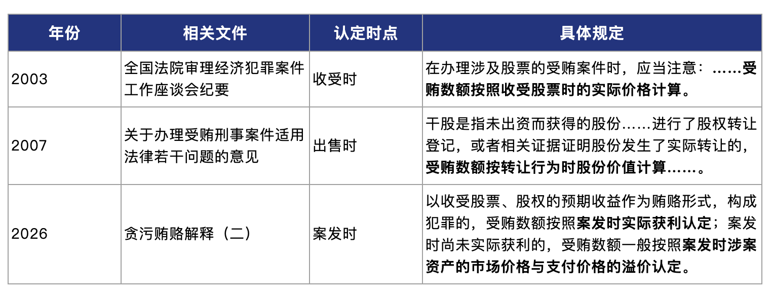 根据相关司法解释及文件,对于预期收益型贿赂的受贿金额,我国曾采用“收受时”或“出售时”作为认定时点,《贪污贿赂解释(二)》将认定时点后移至“案发时”,无论是实际抛售获利,还是持有未售,均按案发时的市场溢价计算受贿数额。这意味着,即便行为人支付了股本金,上市后的巨额溢价仍可能全额计入受贿数额,大幅提高了量刑风险。