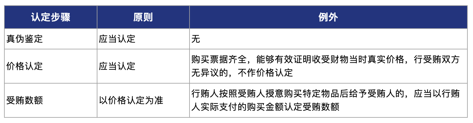 此外,《贪污贿赂解释(二)》对于真伪不明财物和特定财物(珠宝、玉石、字画、手表、贵重金属等)的价值认定也作出了规定,具体如下表所示: