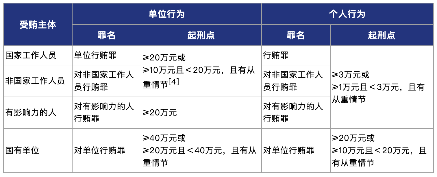 《贪污贿赂解释(二)》明确,对单位行贿罪、单位行贿罪在生态环境、财政金融、安全生产、食品药品、防灾救灾、社会保障、教育、医疗等领域行贿实施违法犯罪活动的,将上述情形作为从重处罚的依据。这一规定实质是沿用了《刑法修正案(十二)》对行贿罪从重处罚情形的规定。《刑法修正案(十二)》于2024年3月1日起施行,其重点之一便是增设了七种从重处罚情节,上述民生领域行贿即属其中。对于具有从重处罚情节的,在入罪标准或者进入下一档处罚区间的数额标准一般降低为不具有从重处罚情节的一半左右,例如行贿类犯罪的起刑点如下表所示: