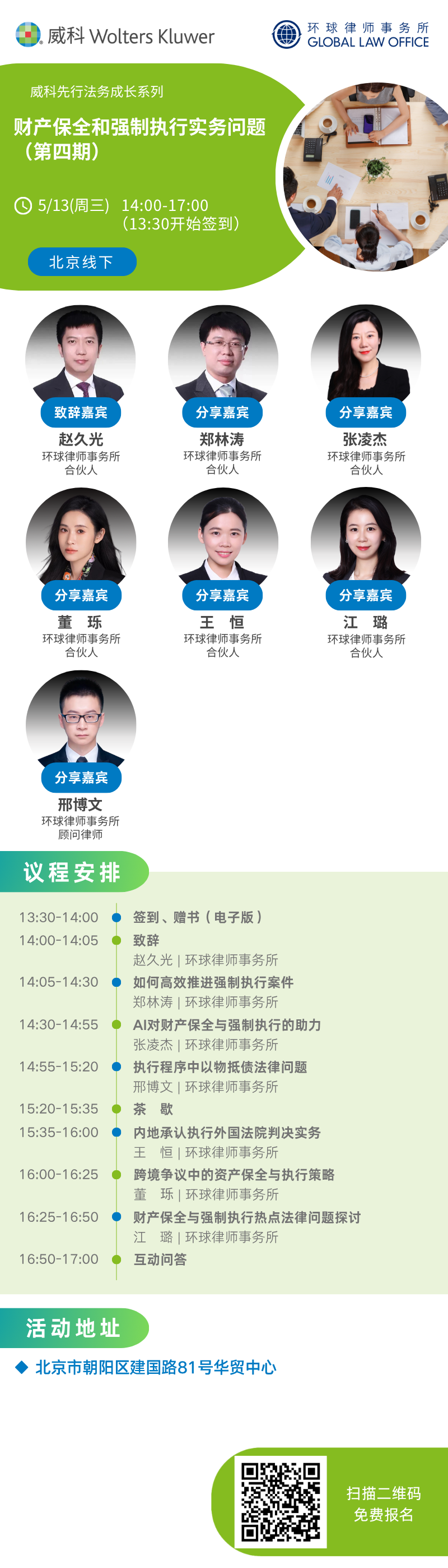 本次研讨会将由环球律师事务所郑林涛、张凌杰、王恒、董𬍛、江璐、邢博文作为主讲人,从财产保全、强制执行程序的相关法律规定、司法实践等多个角度进行介绍,为优化保全、执行流程、推进涉外执行,化解执行困境等问题提供实务操作指引和专业建议。诚邀您的参与!